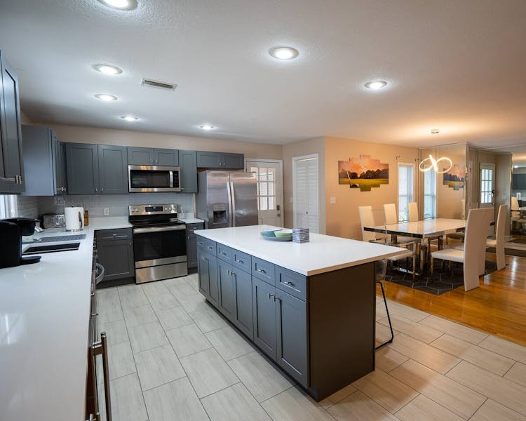 Kitchen: Fully equipped kitchen with dishwasher, Keurig coffee maker, kettle, pans/ pots dishes, knife set, measuring cups, variety of cups, and glasses alongside the chinaware closet. The kitchen has an open concept with a bar, and you can serve your loved ones from the stovetop!